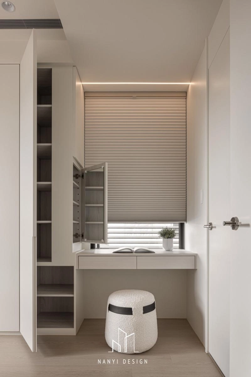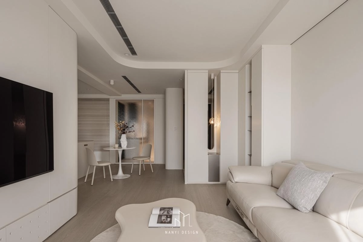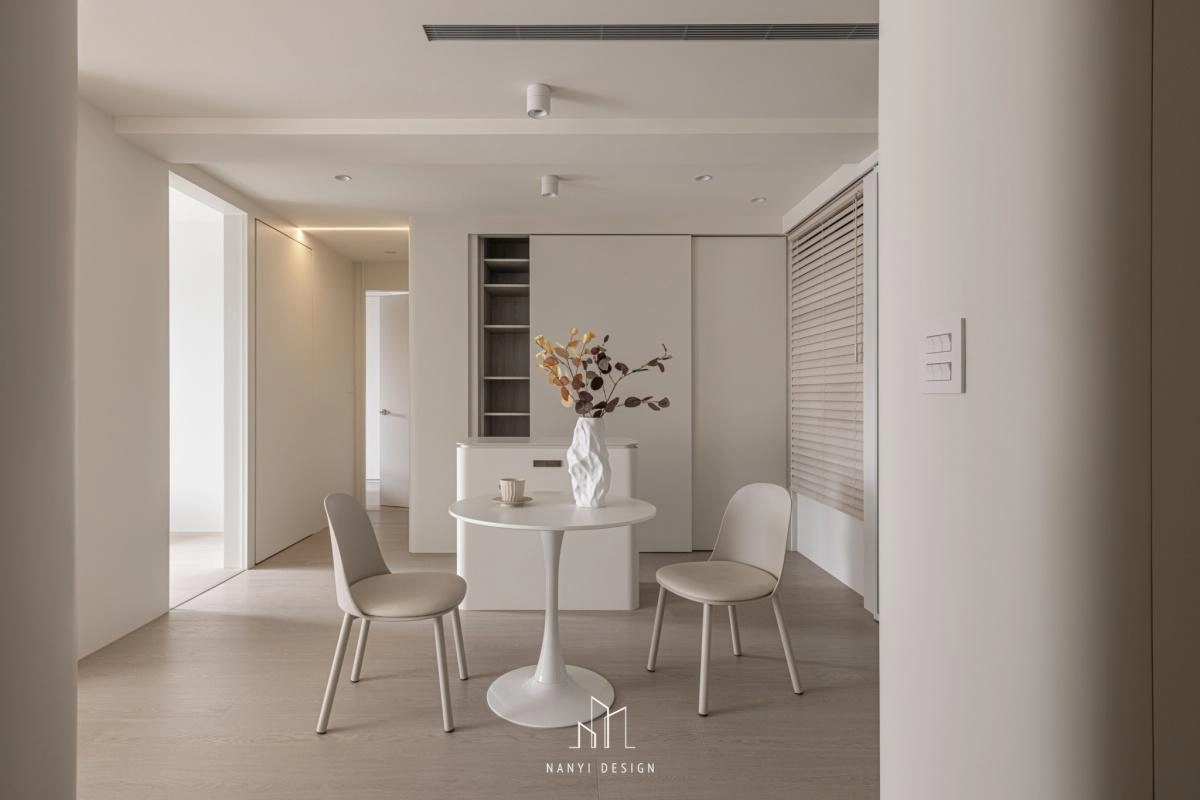 在公共空間中,電視牆設計成點點圓孔的隱藏設備櫃、中鳥旁的儲物間與食物儲藏櫃、