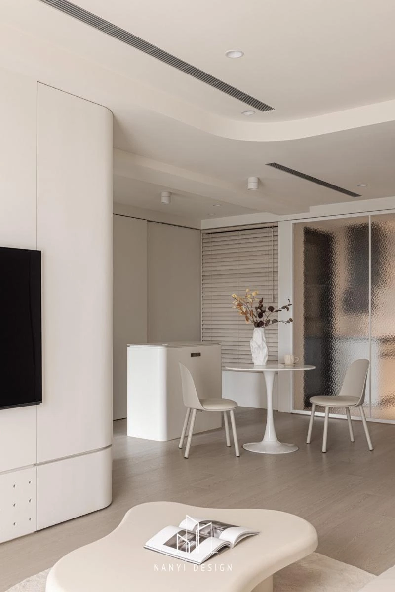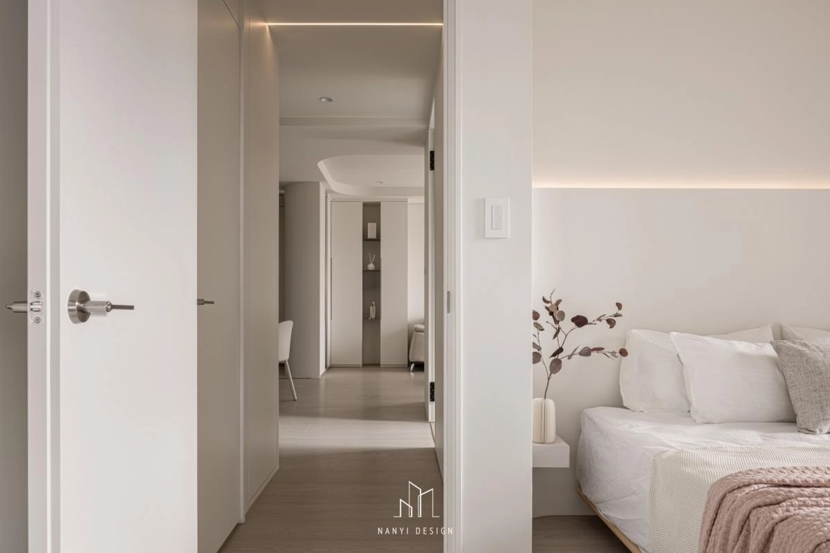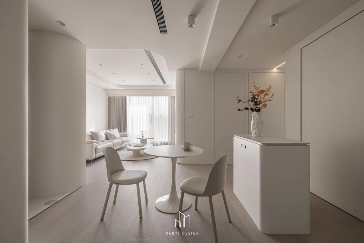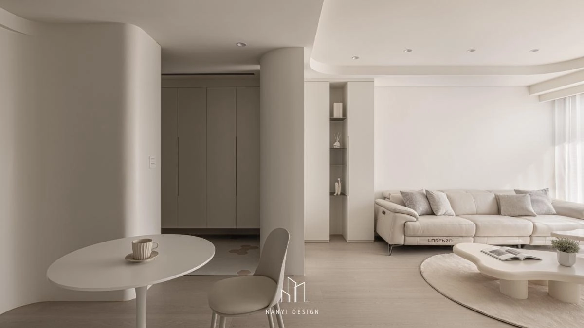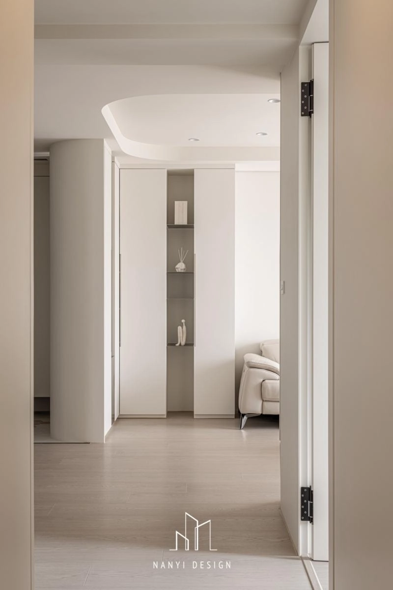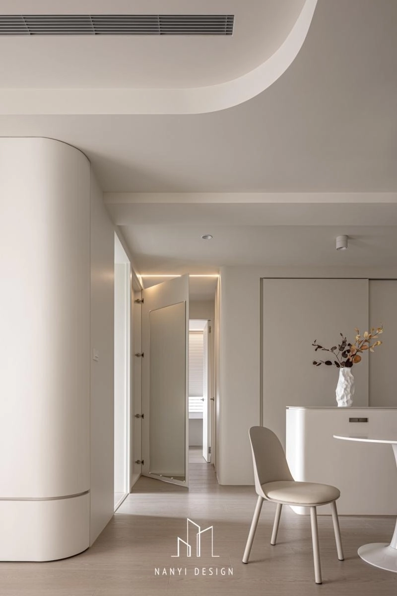走道預設為瑜珈活動所隱藏的全身鏡,以及各空間內櫃邊、牆面,刻意以弧形收邊,