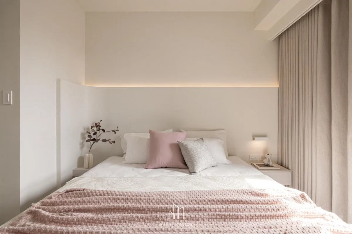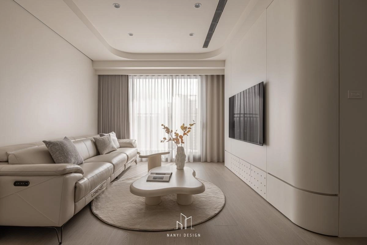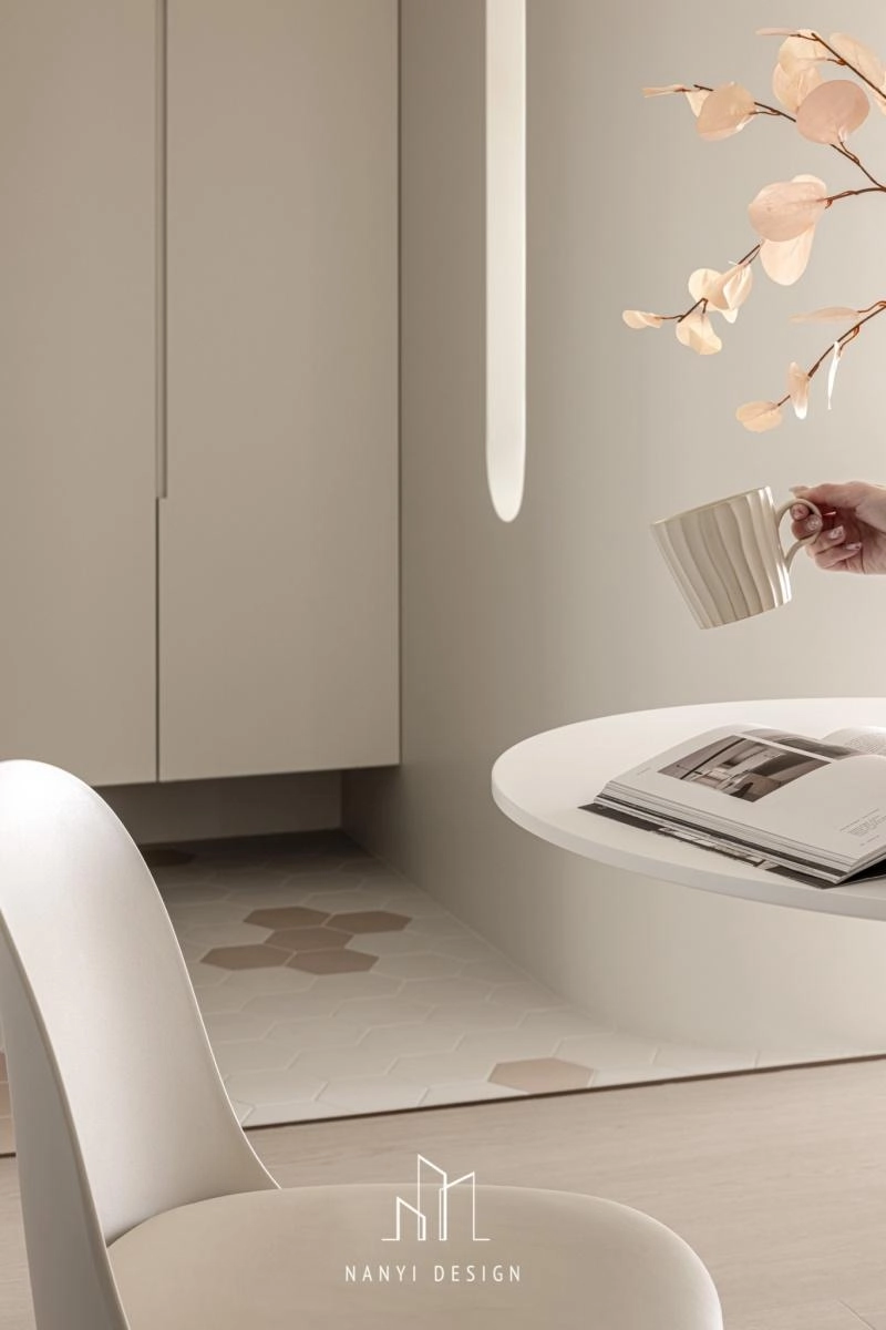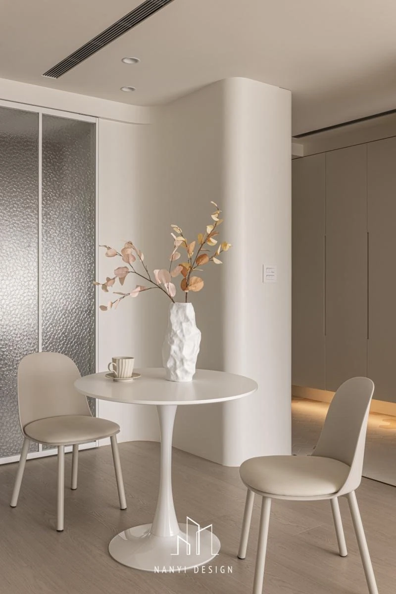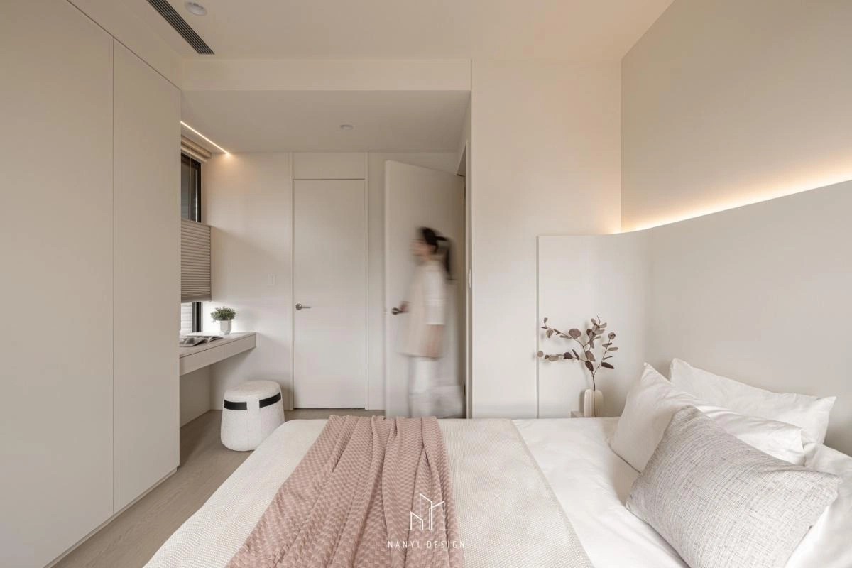 走道預設為瑜珈活動所隱藏的全身鏡,以及各空間內櫃邊、牆面,刻意以弧形收邊,
