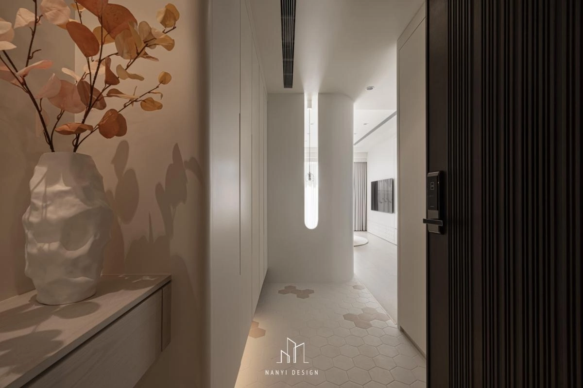 進入玄關,輕踏六角磚進入空間中,前方隔屏刻意開出與客廳能相望的長型孔洞,