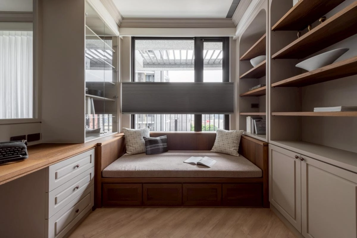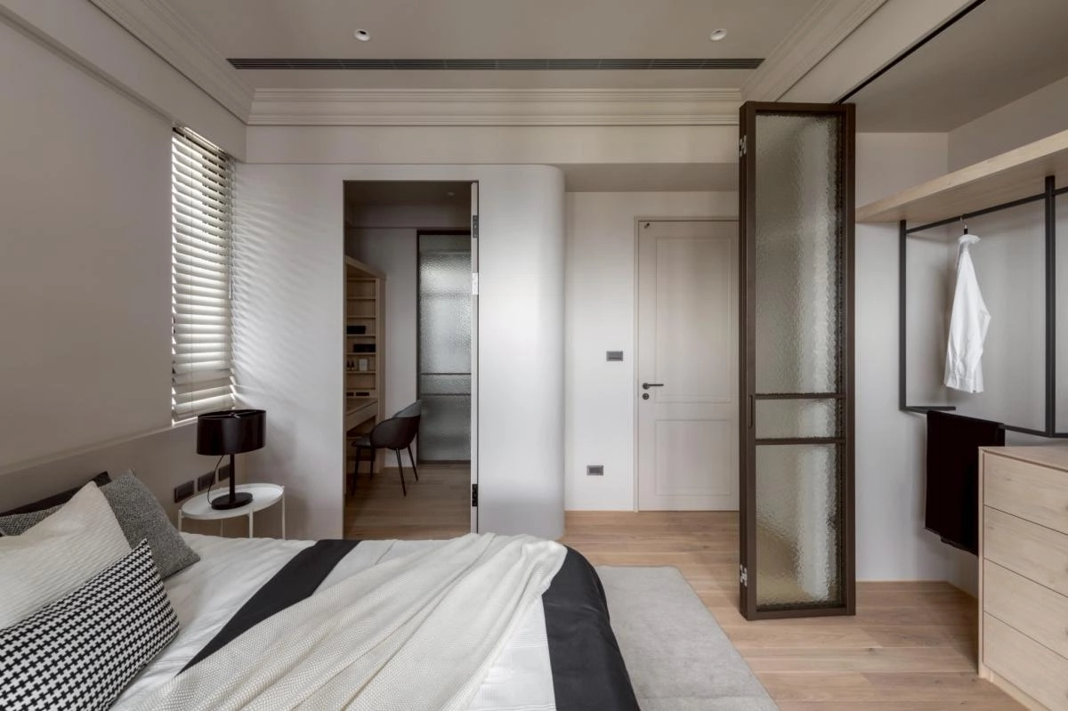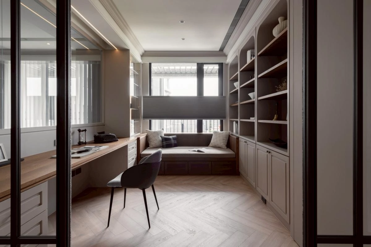 生活機能則被精準整合:大量儲物配置、獨立且寬敞的更衣室、以及帶有穿透性的書房——放下窗簾後,既保有隱私,開啟又讓光線與視覺的延伸感能自由進行。