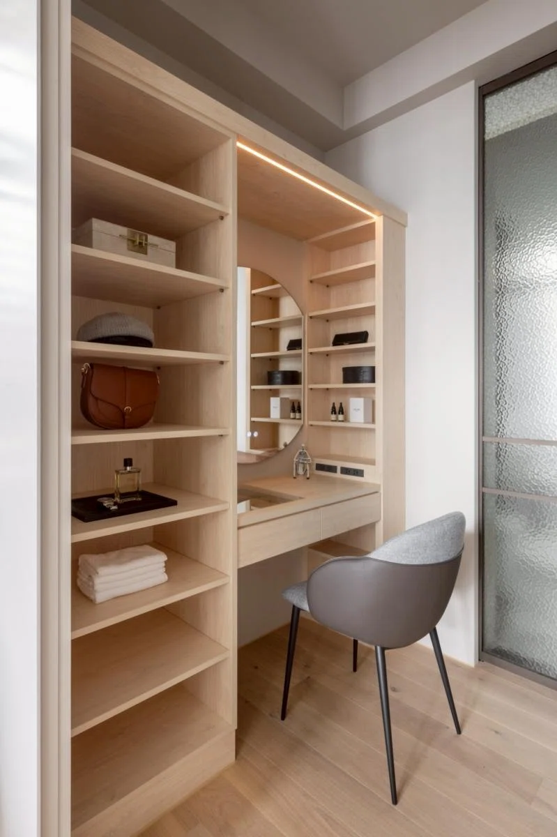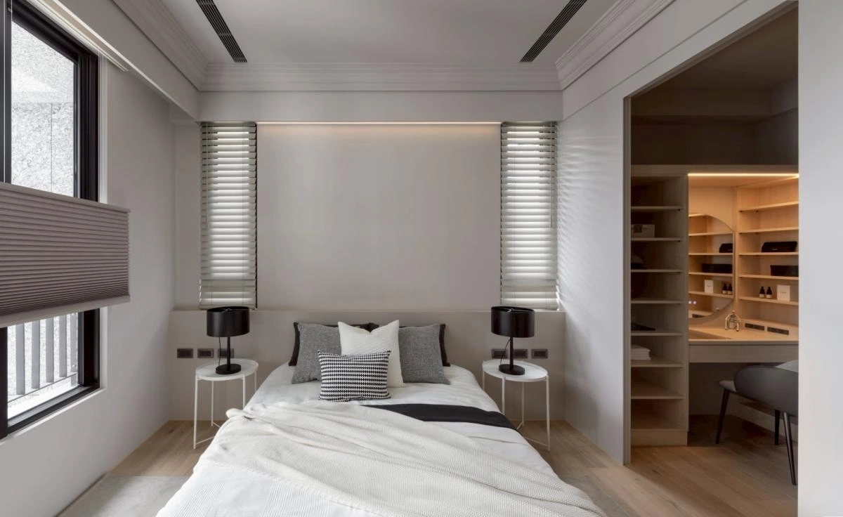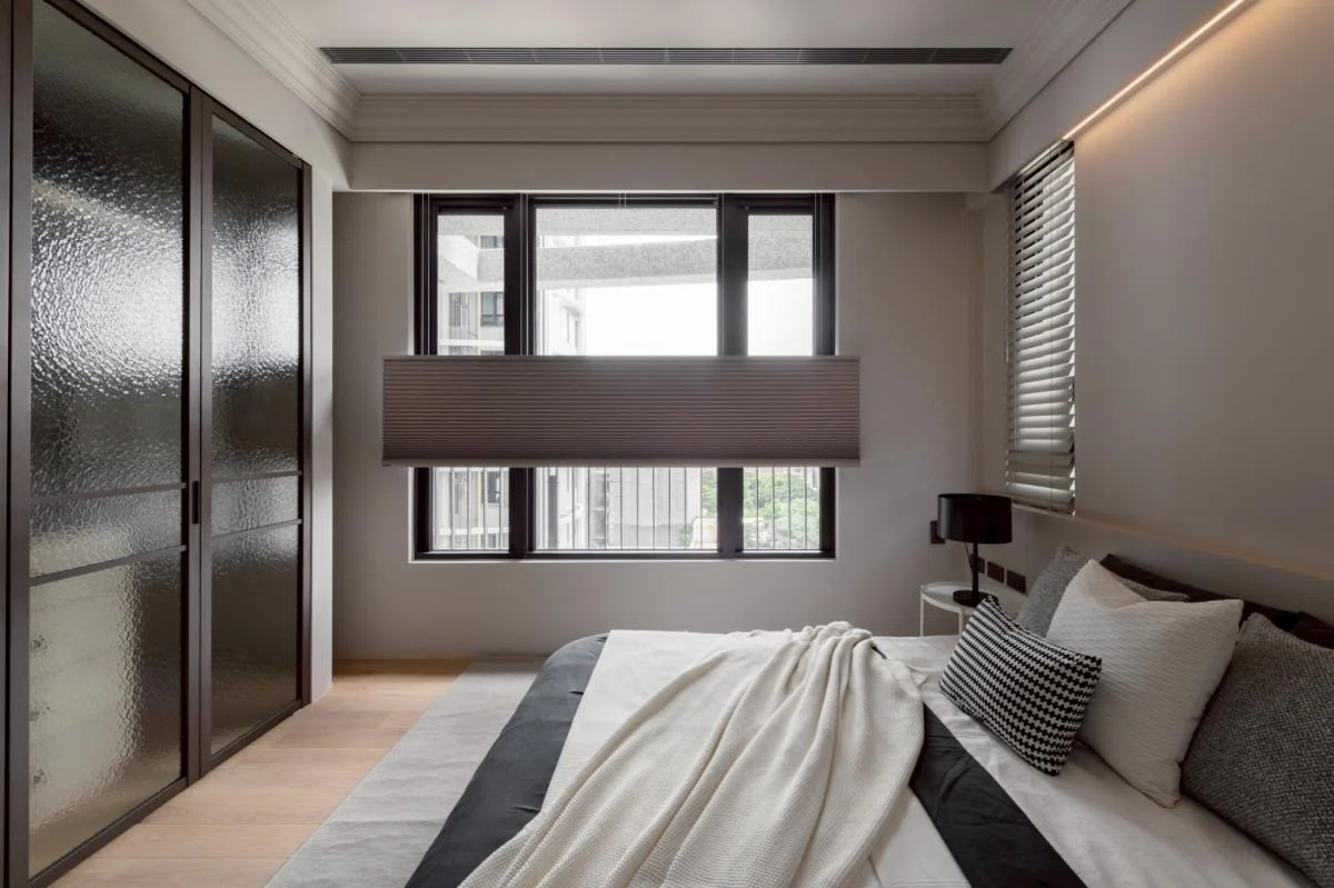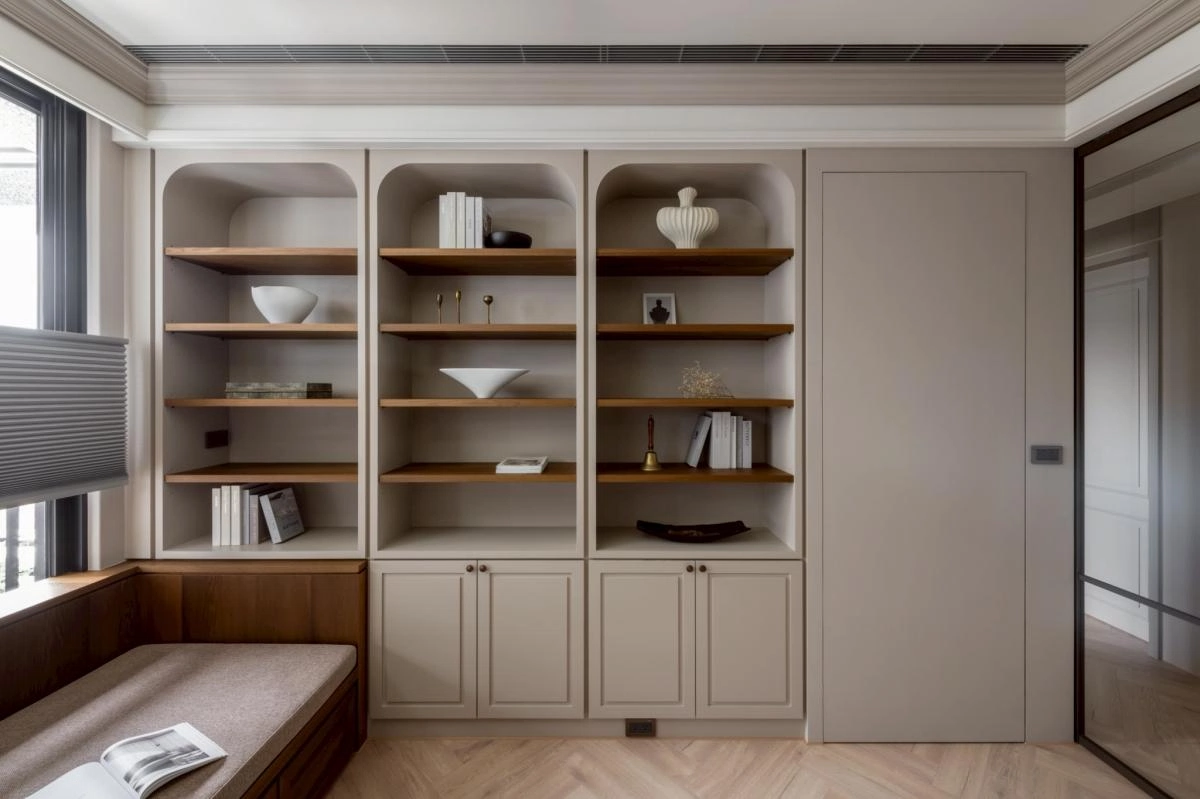 生活機能則被精準整合:大量儲物配置、獨立且寬敞的更衣室、以及帶有穿透性的書房——放下窗簾後,既保有隱私,開啟又讓光線與視覺的延伸感能自由進行。