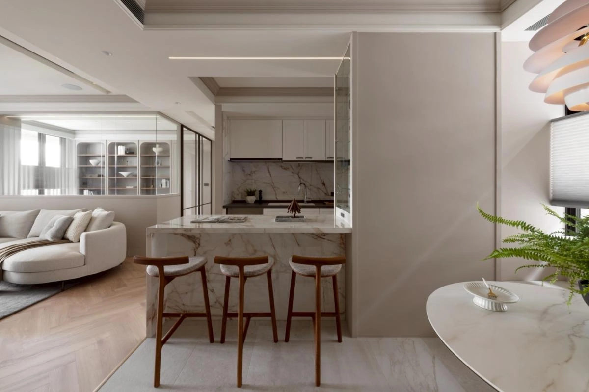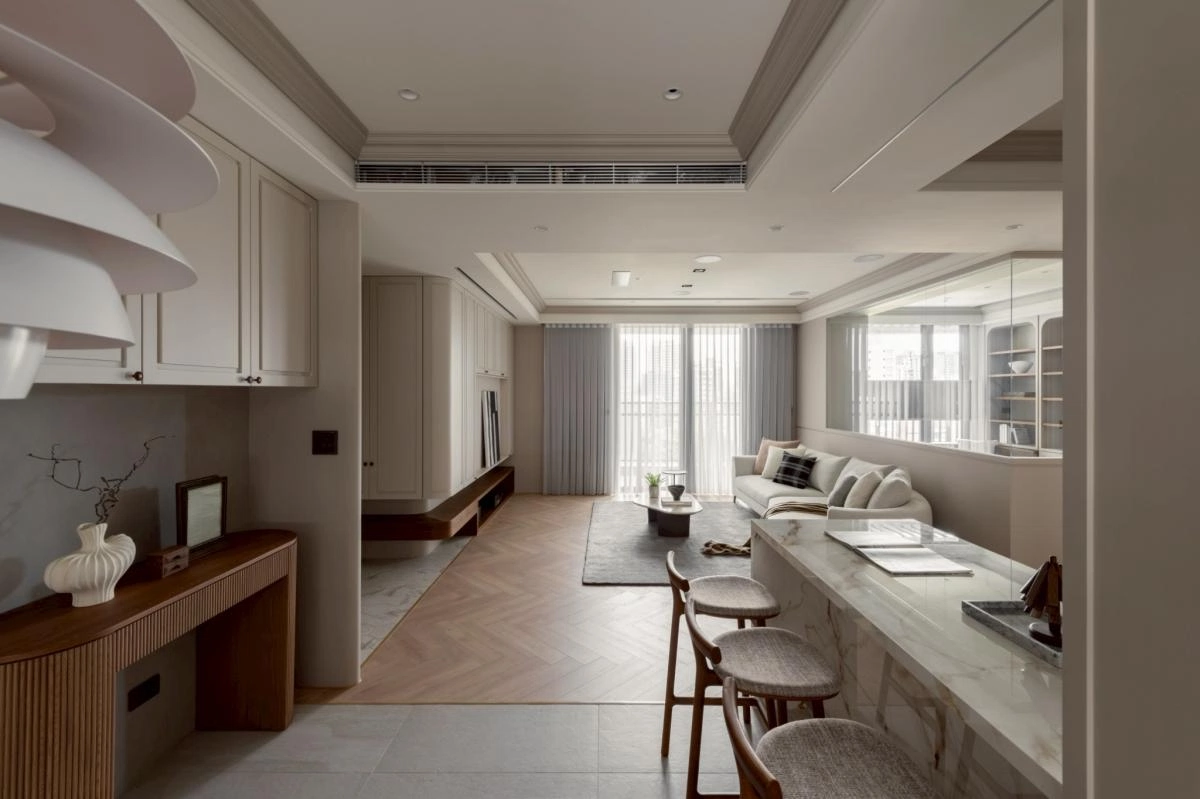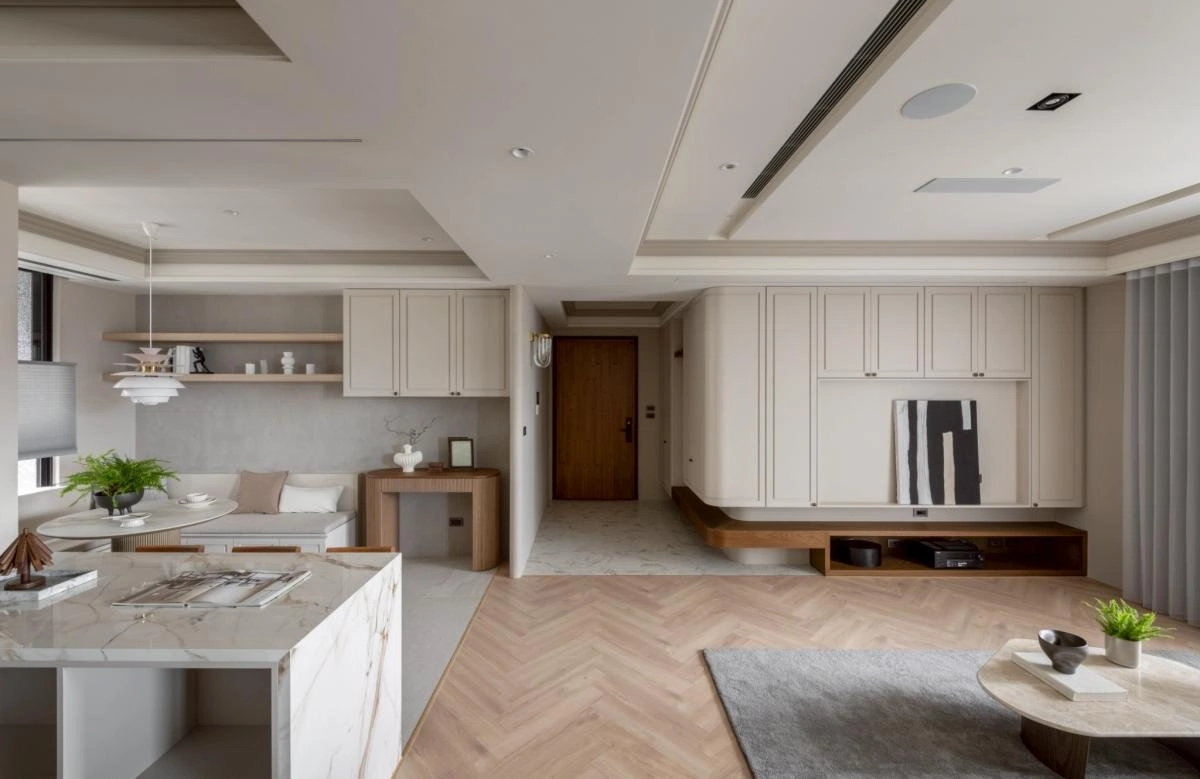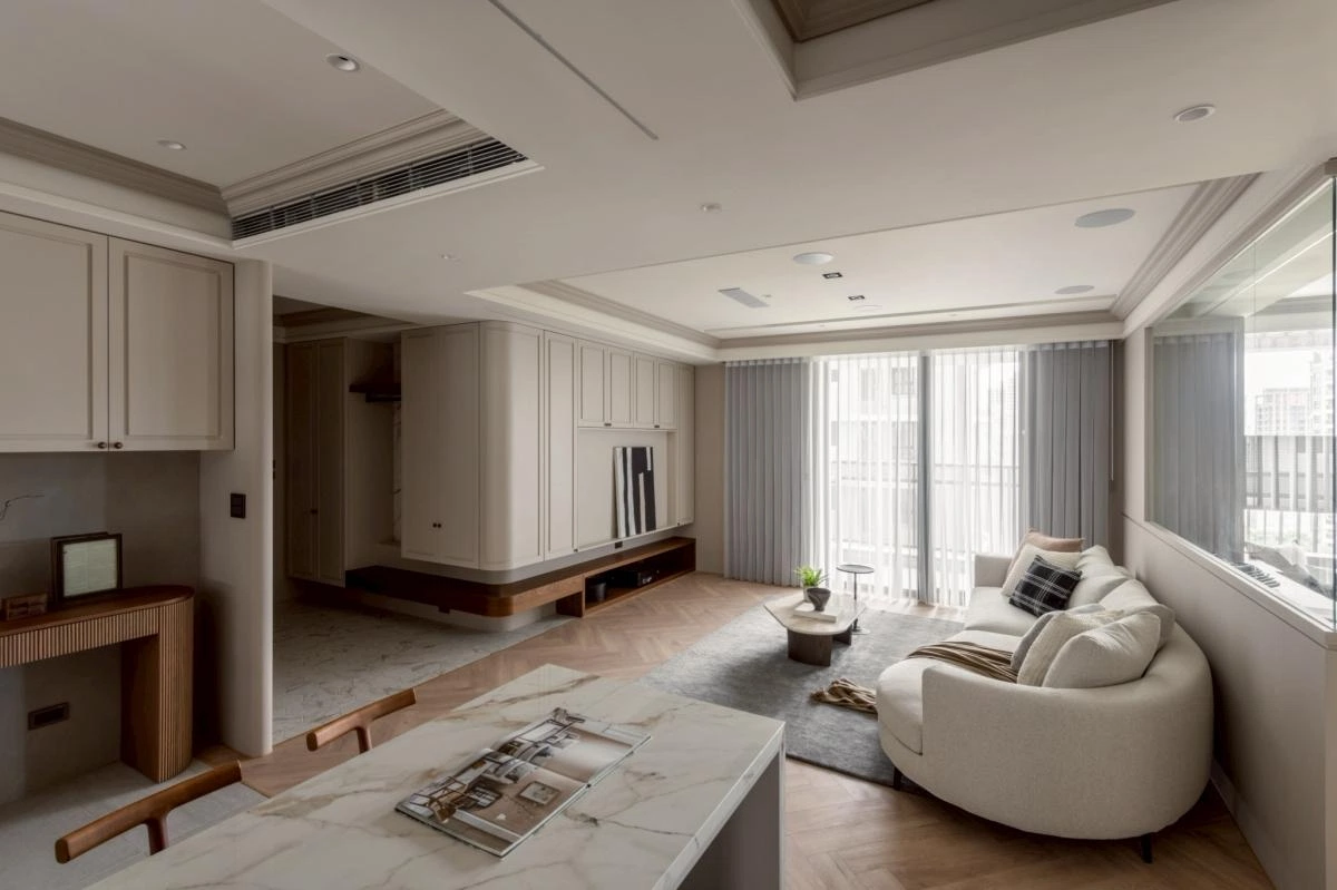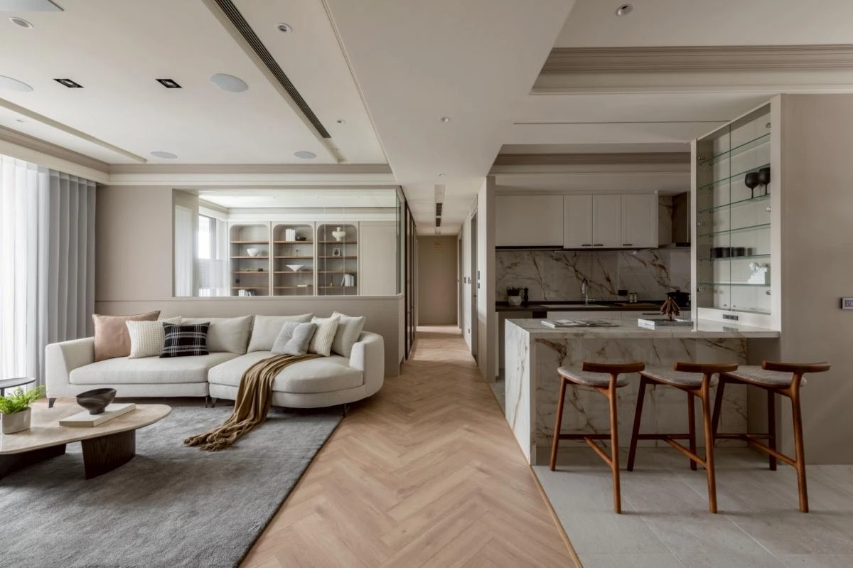 整體以柔和沈穩的調性展開,動線被規劃得流暢而自然,讓居住者在空間中行走時,每一步都能感受到輕鬆自在的節奏。